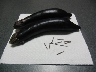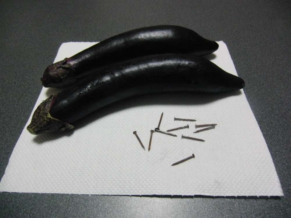 ナスは切るとすぐに変色してしまうので、わざとさびさせた釘を一緒にぬか床に入れるんです。そうすると不思議なことに、ぬか床からナスを取り出してもきれいな紫色のままなんです。