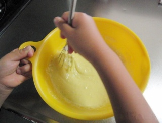 - ボールにホットケーキミックスの袋に書かれている材料を分量どおりに入れて混ぜる。