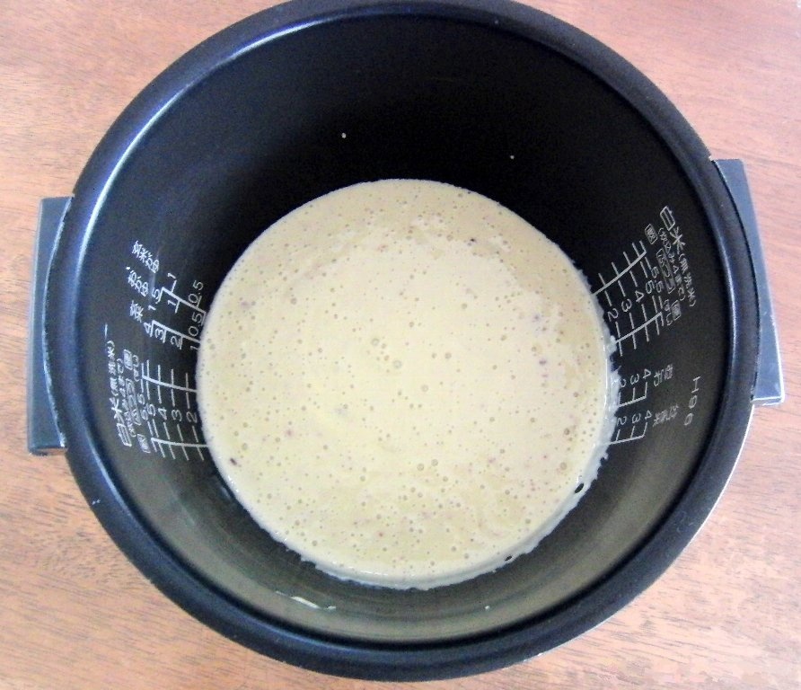- 炊飯器の釜へ流し込み炊飯器のスイッチを入れる。
