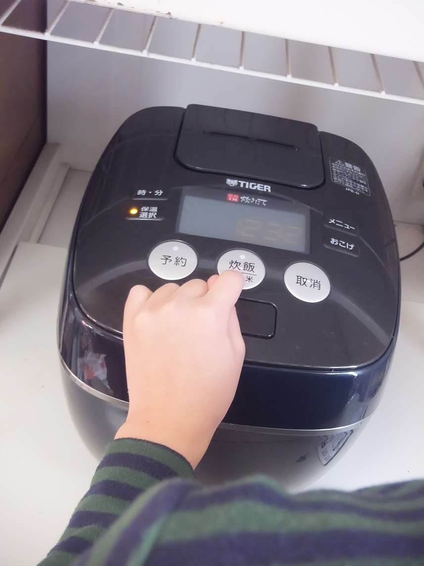 こどもが最初から最後まではできないので、お母さんが料理苦手と思ったりせず、こどもにさせなきゃと思うのではなく、ごはんを炊いてみるだけでもいいかなって。お母さんがお米を洗って、「じゃーってしてね。」って、こどもに水を入れてもらって、スイッチを押してもらうだけでも「やったね!」「できたね」「おいしいね」って。こどもは作った気になると思うの。
