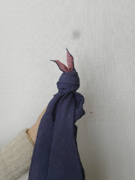 ふろしきの4つ端をひとつ結びにすると、ベレー帽に変身!