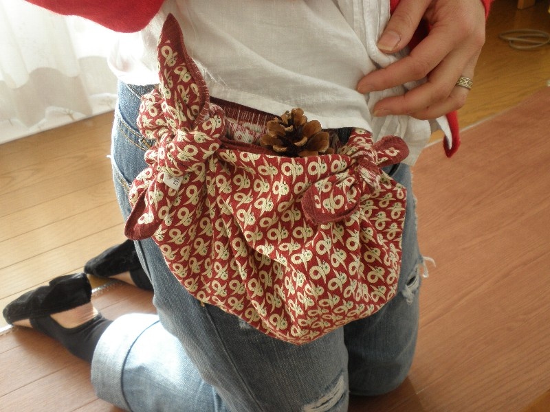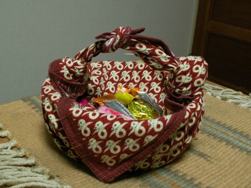 端を“ひとつ結”びにしたふろしきを動かしながら、