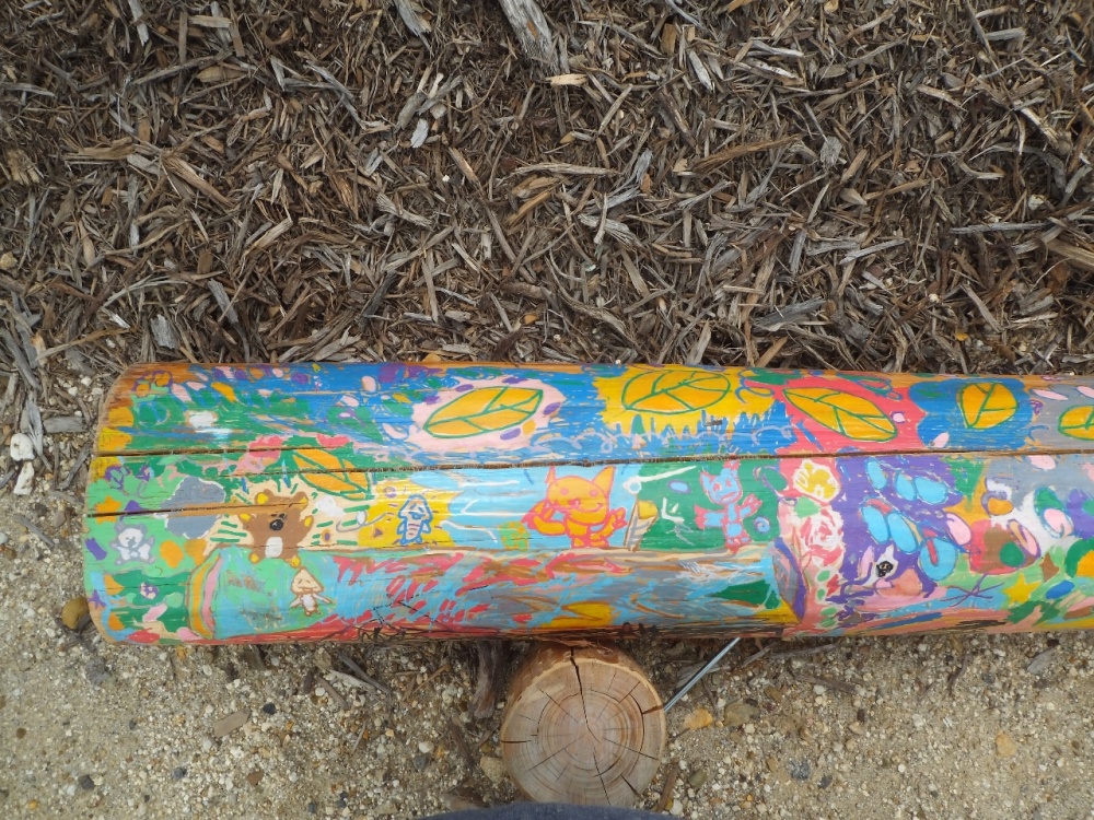 ・間伐で切った丸太を使ったベンチに親子で一緒に絵を描く