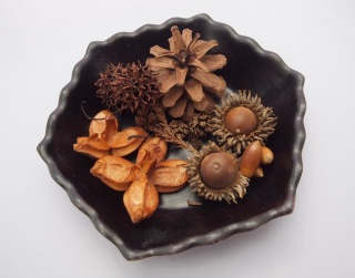 木のお皿とかに、拾ってきた木の実を飾ったり。
