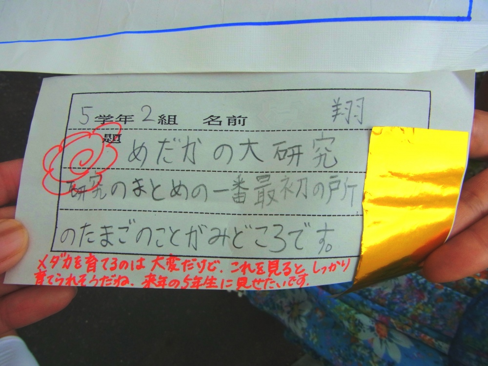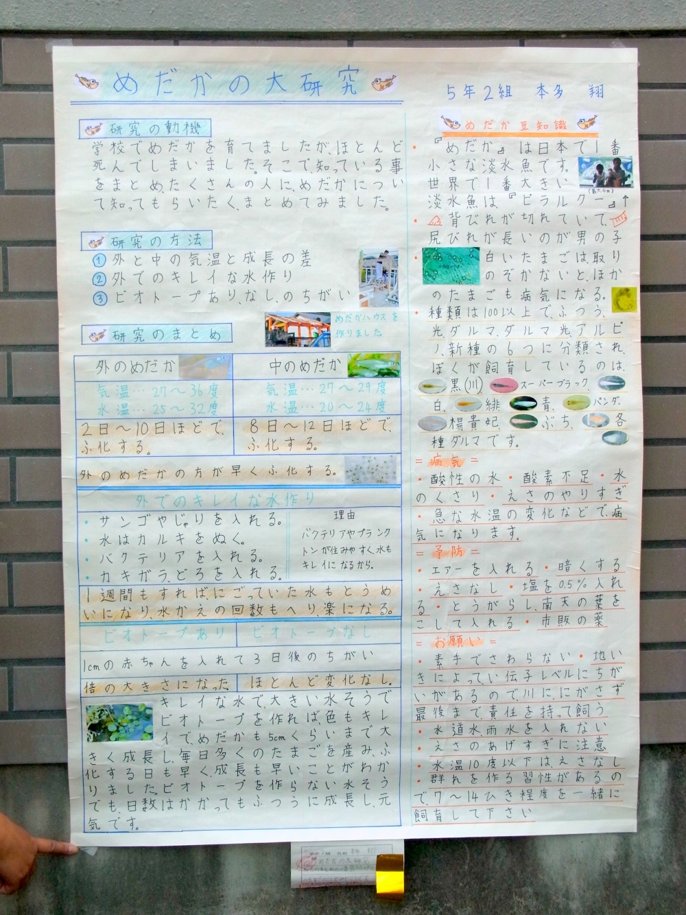 メダカの研究では、「みんなにメダカのことをもっと知ってもらって、大切にして欲しい」そんな思いで、こどもがB紙(模造紙)にまとめました。