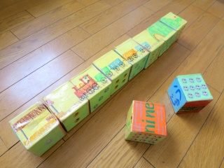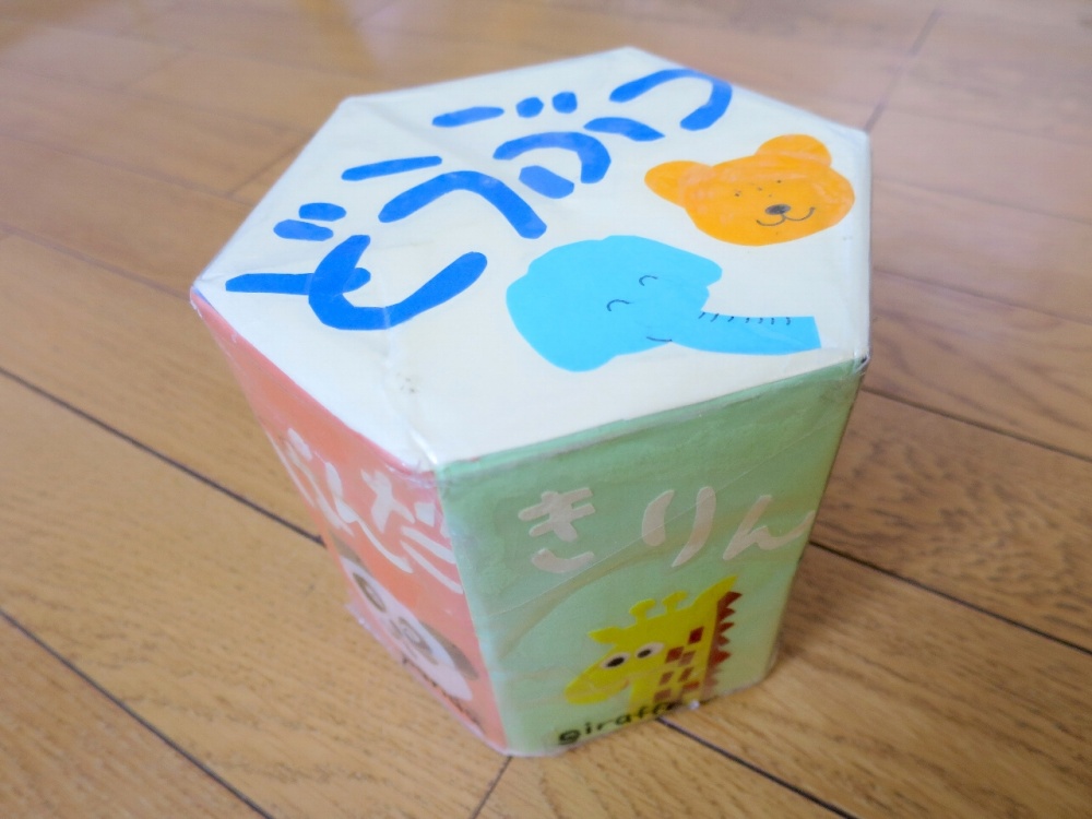 大きなサイコロ型の玩具の6つの面には、それぞれ絵や数字を描きました。