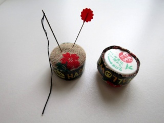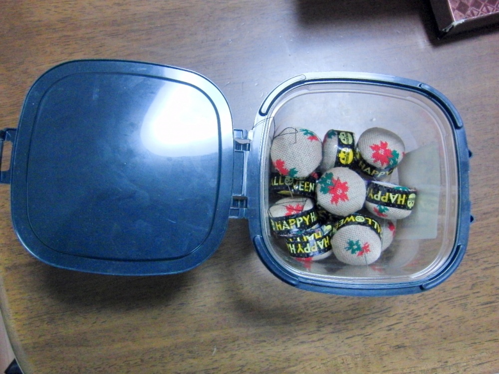 布をかぶせて小さい針山をたくさん作りました。数人の子を集めてアクセサリーを作ったときに、一人に一つずつ配って使いました。