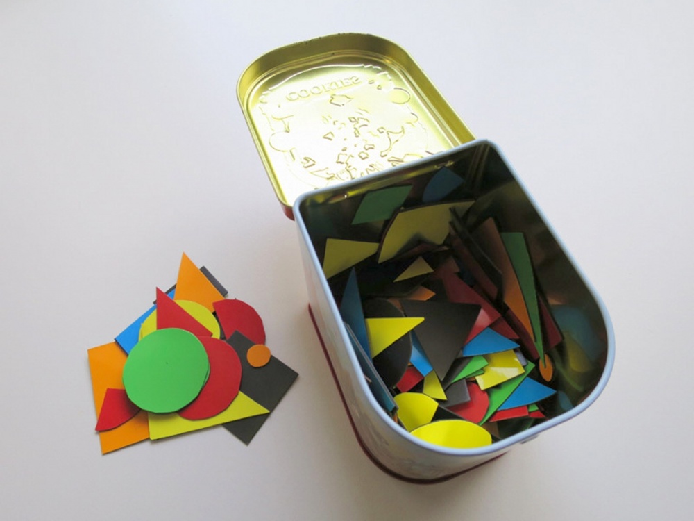 カラフルなグネットシートを、三角や四角などのいろんな形に切りわけて、お菓子が入っていた缶に入れておきました。