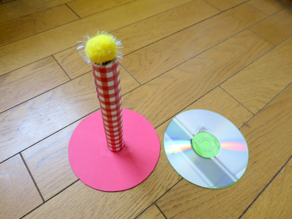 不要になったアルミ箔の芯や包装紙の芯に、色紙や模様を描いた紙を巻いて、上にポンポンを付けて、不要になったCDの上などに立てます。