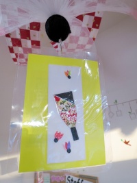 だから、天井から吊りさげる飾りを作ったとき、花や文字などはインターネットのイラスト。無料でダウンロードできるサイトのものを使いました。結構素材がいっぱいあって、充実しているんですよ。使いたいものを印刷し、それを切り取って貼り付けました。