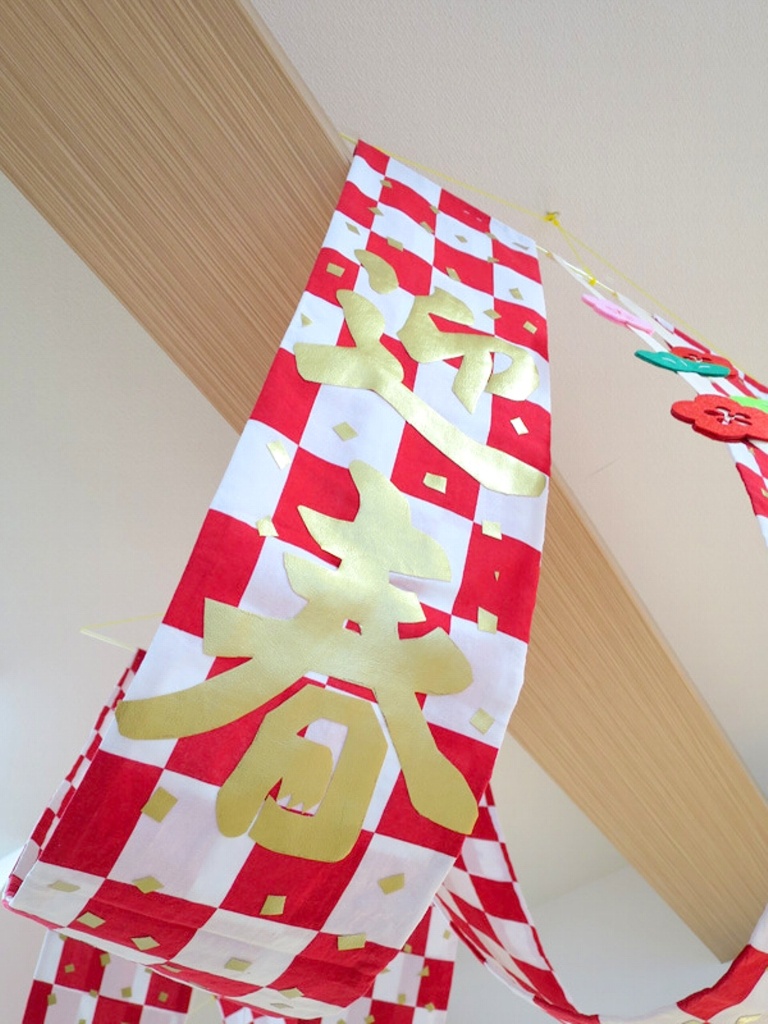 ウレタンマットと大きな布と紙があれば、年中楽しめる壁飾りができます。