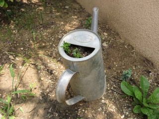 使わなくなったじょうろを鉢の代わりにしたのが右の写真です。
