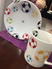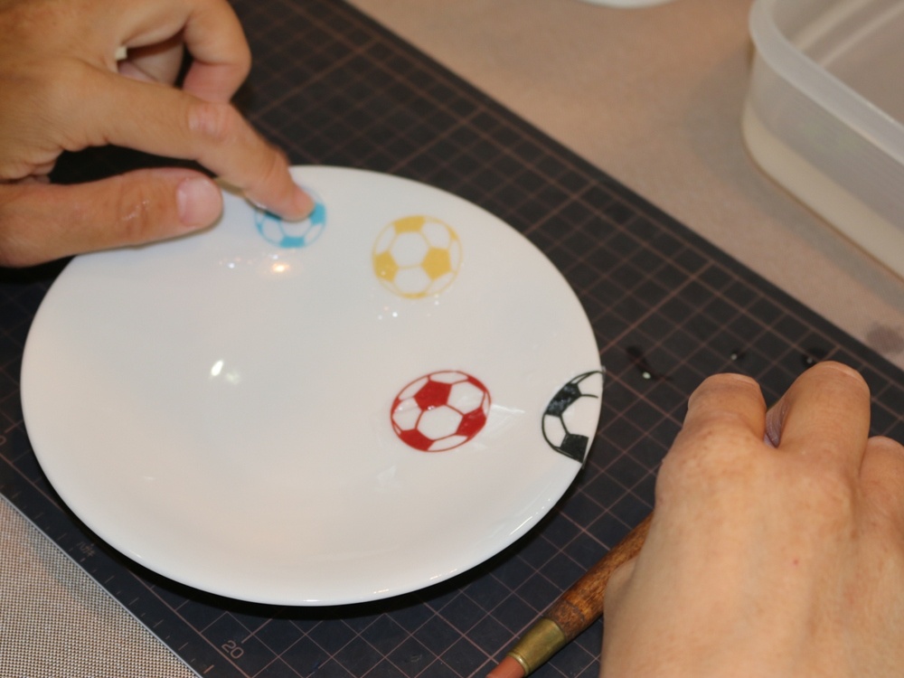 12センチのプレートにワンポイント柄(サッカーボール、花)などを貼っていくやり方で、初めてでも簡単にできます。