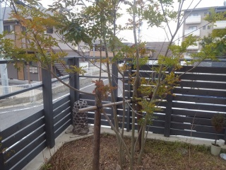 外からの目隠し用に1本植えたシマトネリコは背が高く、半常緑樹なので葉が落ちにくいから手入れしやすいんです。小さな黄緑の葉がたくさんついているんですよ。