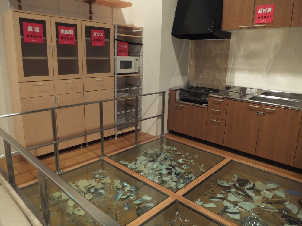 「食器があぶない」「食器棚があぶない」「ガラスがあぶない」という赤い貼り紙を見ながら