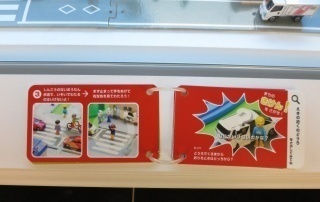 交通安全学習センターのバスや教習所の車など市販されていないオリジナルのミニカーもありますよ。ところどころに「まちの中の危険を探そう」と危険場面のミニカーの写真を掲載したヒントカードが置いてありました。それを見て、交通に潜む危険を探すと同時に、安全行動の気付きを促すようにしているんですね。
