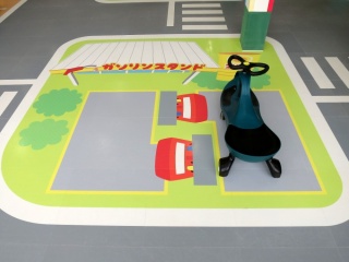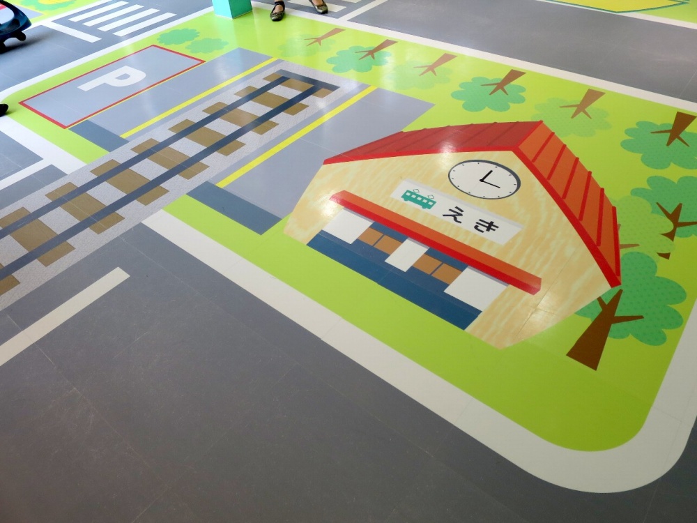 意外に簡単なので、小さなこどもたちに人気だそうです。まちなみは、信号付きの建造物を中心に床にガソリンスタンドやコンビニエンスストアなどが描かれていて、横断歩道や踏切もあります。