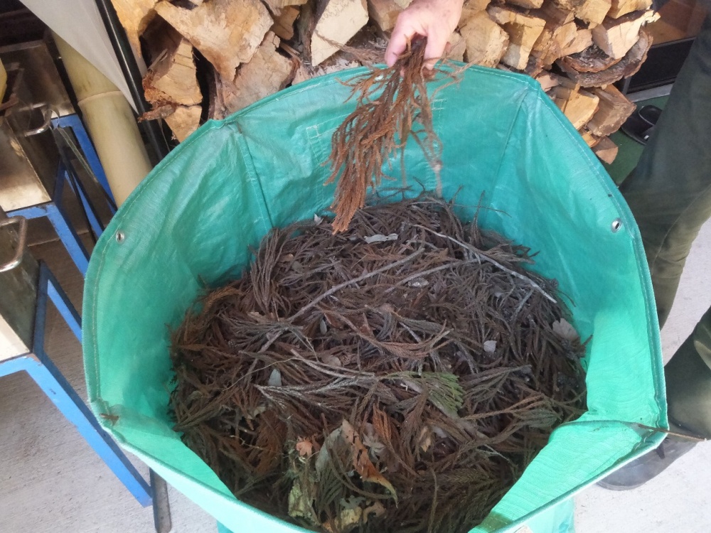 火起こしは、乾燥したスギの葉→竹→薪の順に積み上げて火をつけます。乾燥したスギの葉は紙より火力があるんです。
