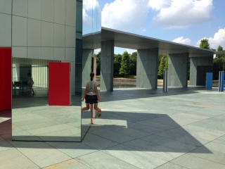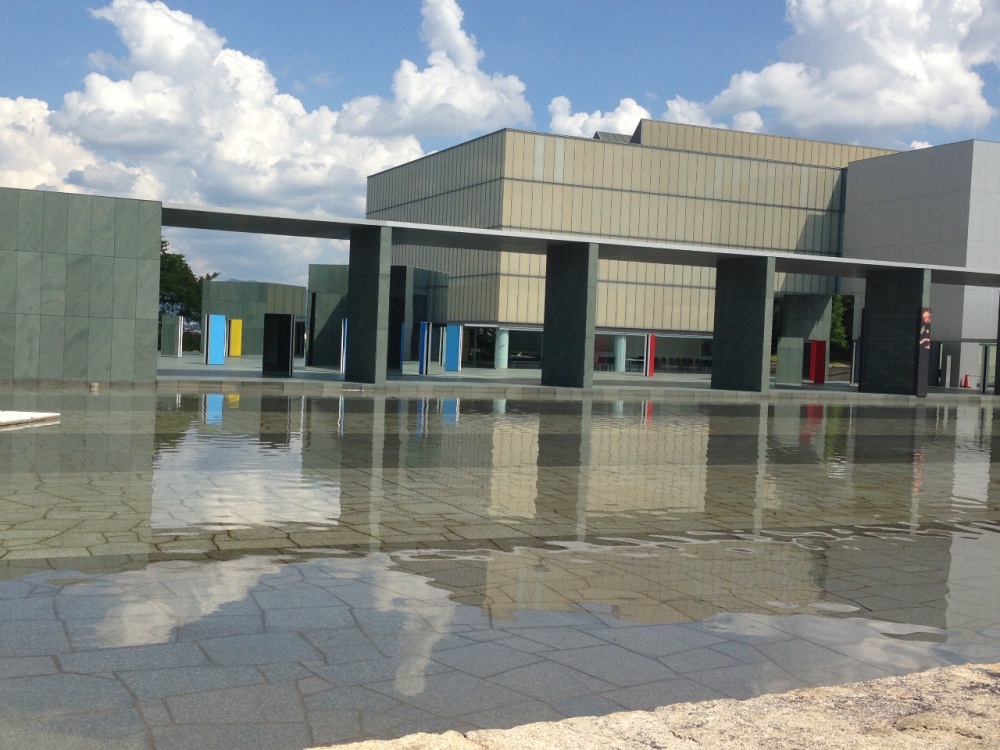 スロープを登ると池が夏の青空と雲を映して清々しい。