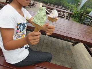 こどもはブルーベリー&ミルク、わたしはお茶のジェラートを選び、テラスに出て、川のせせらぎを聞きながらさっそく「いただきます!」。