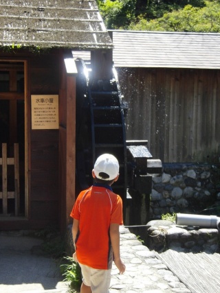 外に出ると、回る水車を発見。