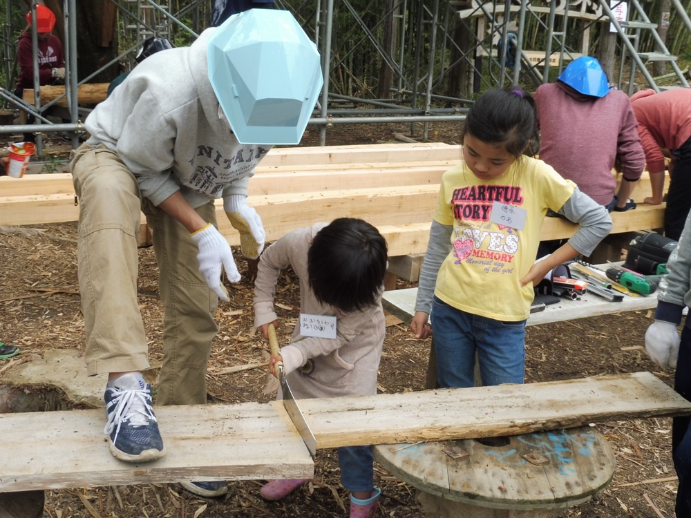 例えばブランコを作るとしたら、こども対象ですが大人も多少来ているので、こどもと大人のグループを作って、ブランコを作るからそのグループで考えて作ってみてね、という感じなんです。