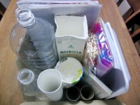 材料は、段ボール、トイレットペーパーの芯、アルミホイルやラップの芯、食品トレー、チラシ、ストロー、牛乳パック、割りばし、ハガキ、紙コップ、ペットボトルなど、どれもうちにあるものばかりです。