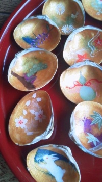 絵を伏せて置き、神経衰弱のようにして遊ぶことができます。ハマグリは対になっている貝殻以外は、柄も形も合わないので都合がいいんです。