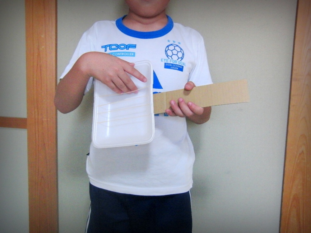 材料:発泡スチロールの食品トレー、輪ゴム2本、段ボール
