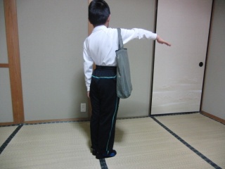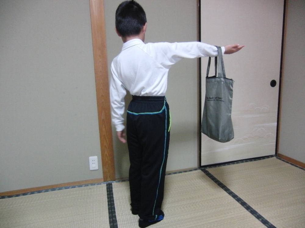 腕を水平に伸ばして、肩の方から順に手のひらの方へ位置を変えてバッグをかける実験です。
