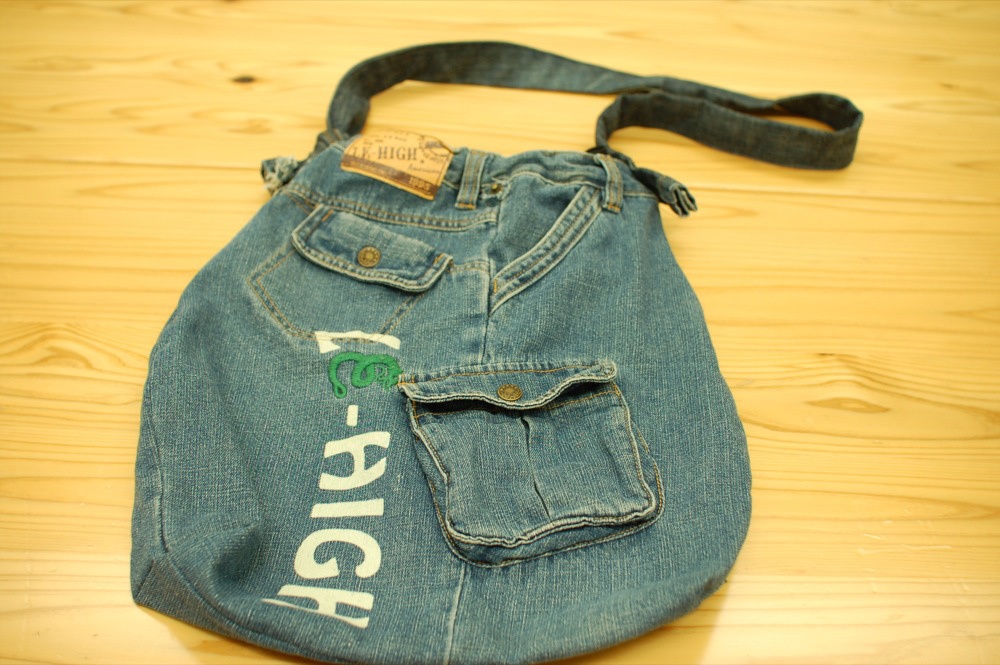 このバッグの手持ち部分はジーンズを結んで付けました。